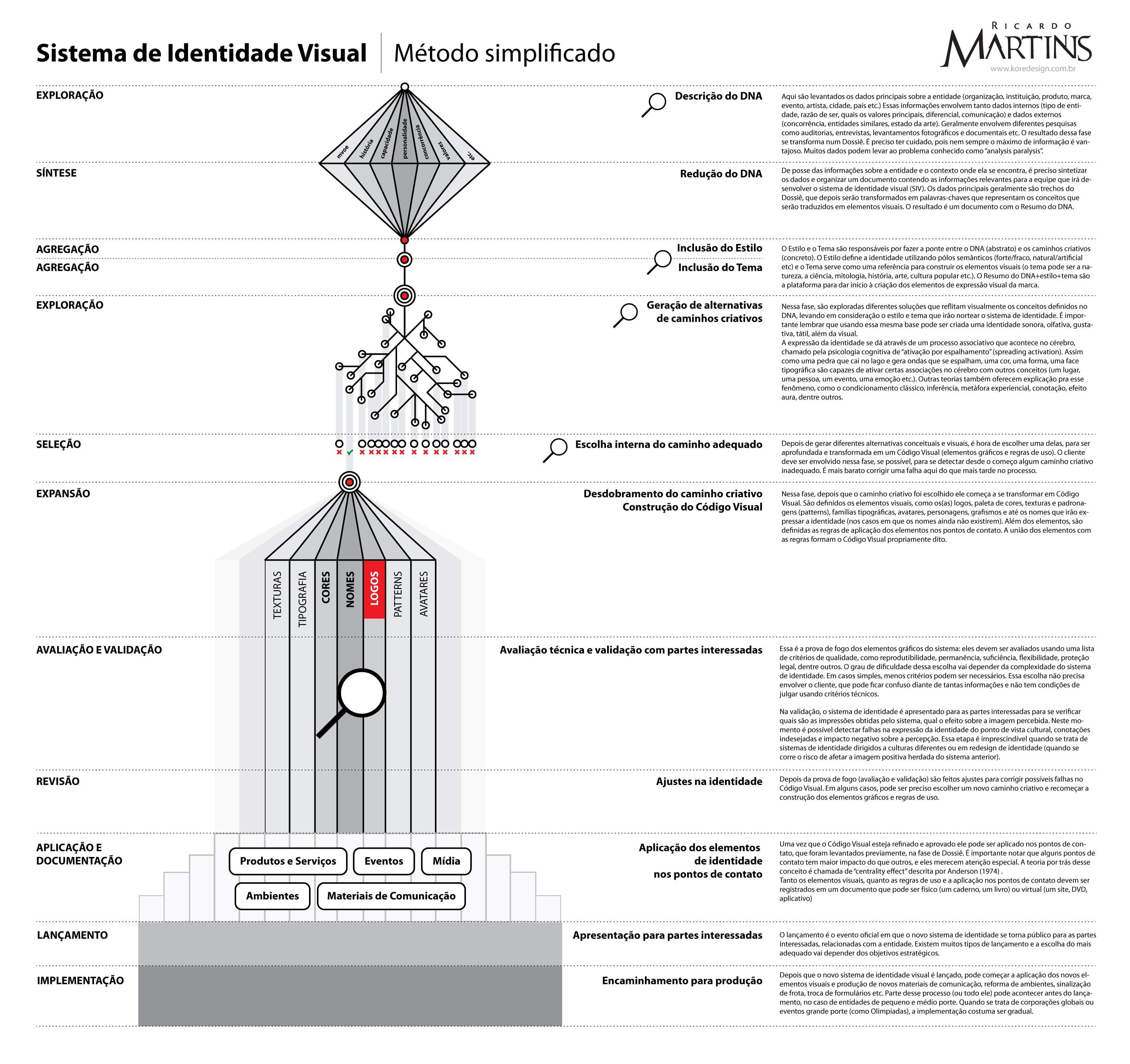 A construção de um sistema de identidade visual (SIV) pode ser realizada de diversas formas, seguindo diferentes caminhos. O que eu apresento aqui é uma sugestão de método para visualizar melhor as fases de construção do SIV e suas relações. Procurei tornar o infográfico mais simples, reduzindo a quantidade de informações, de modo a privilegiar o entendimento básico. Obviamente, diferentes designers usam diferentes caminhos, alguns mais simples, outros mais complexos. Independente da maneira como se faz, o importante é sempre refletir sobre o método utilizado e criticar cada etapa, pois se uma parte do processo for mal-feita, o resultado das etapas seguintes fica comprometido. Um erro na definição do DNA afeta todo o projeto assim como um erro de seleção do caminho criativo também pode levar a uma solução que não resolve o problema.